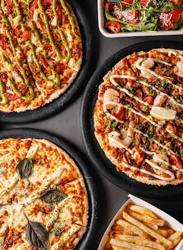 Tomato garlic base, marinated Moroccan lamb, cherry tomatoes, spanish onions, chilli flakes, olives, feta cheese, mozzarella topped with mint yoghurt and lemon wedge.